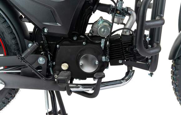 Форестер 200 доступен в красном цвете и отличается классическим функциональным дизайном. Оснащён фарой дальнего и ближнего света, светоотражателями, большим стоп-сигналом. Это настоящая рабочая лошадка с хорошим запасом прочности для тяжёлой каждодневной работы.Диаметр колёс — 18 дюймов. Покрышки с крупными шипами позволяют преодолевать препятствия, уверенно ездить по бездорожью. Большой металлический бак даёт возможность ездить на большие расстояния, не беспокоясь о наличии заправок. Мотоцикл оснащён спидометром с электронным датчиком переключения передач, тахометром. Передние и задние тормоза барабанные, легко регулируются, при необходимости их можно подтянуть даже в полевых условиях.Задняя подвеска включает 2 надёжных амортизатора. Руль обычного сечения с низким подъёмом защищён специальной металлической дугой от повреждений при падении мотоцикла. Также на руле расположен подсос, что позволяет заводить Мотолэнд Форестер, не вставая с сиденья. Мотоцикл Форестер 200 оснащён карбюратором и одноцилиндровым четырёхтактным двигателем 200 см³ с большим ресурсом и тихой работой за счет балансированного вала. Механическая трансмиссия содержит 5 передач. Для запуска двигателя можно использовать электростартер и кикстартер. Мотоцикл Мотолэнд Форестер как многофункциональный трансформер при необходимости позволяет легко увеличить площадь полезной нагрузки. На руле размещён багажник с держателем груза. Также большой багажник есть в задней части мотоцикла, а над подножками встроены специальные увеличители площади для перевозки грузов. Вместительность, неприхотливость в обслуживании, работоспособность — всё это мотоцикл Форестер.