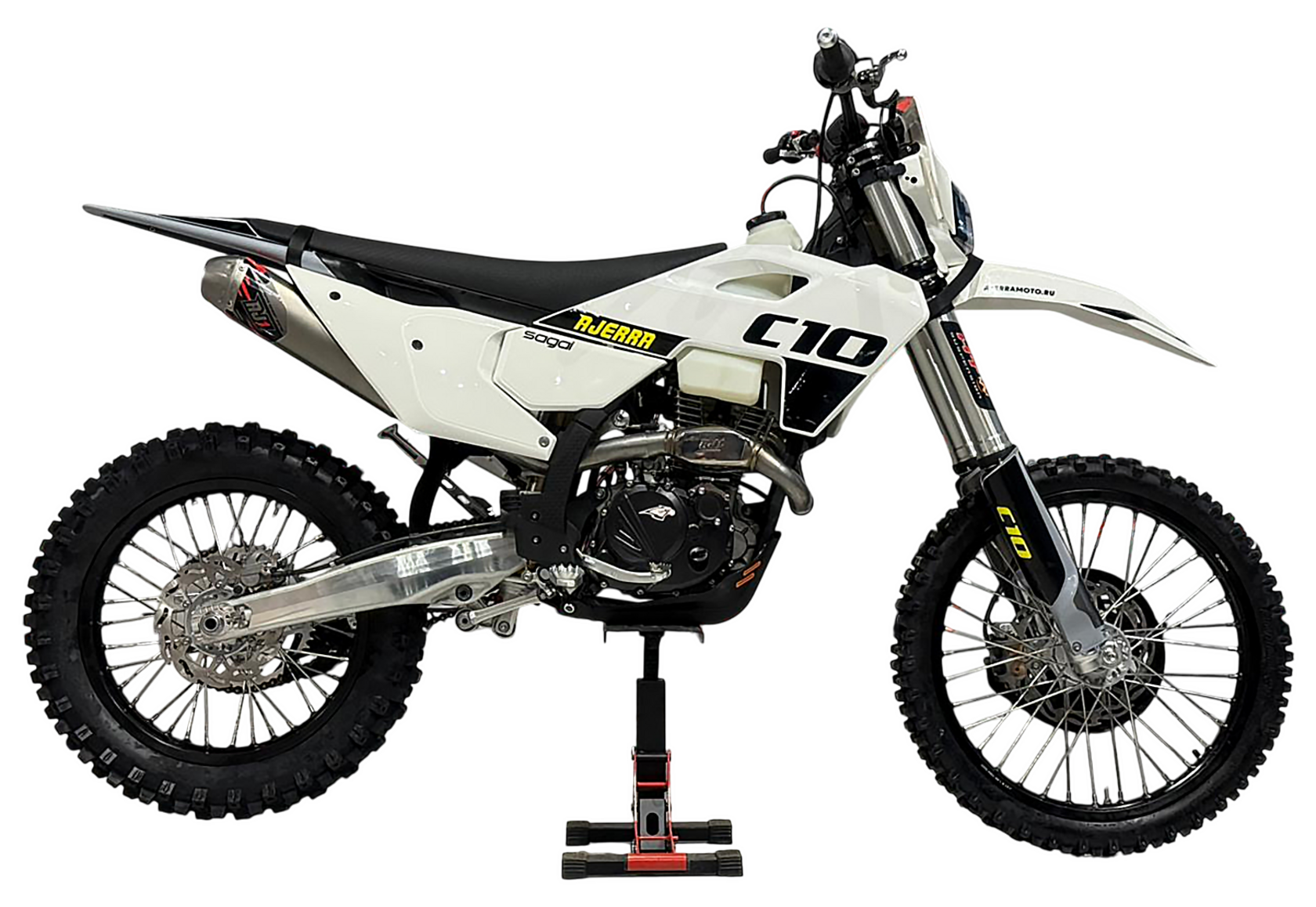 Мотоцикл AJERRA SAGAI C10 YB300H — это современный эндуро-байк, разработанный для уверенной езды как по пересечённой местности, так и по лёгкому бездорожью. Прочная рама К10 завода AJ1, копия KTM 2024 года, обеспечивает стабильность и точность управления в любых условиях, а качественный пластик в стиле Husqvarna 2024 года добавляет динамичный и стильный внешний вид. Двигатель Loncin YB300H 176 FMN с воздушным охлаждением демонстрирует надёжную работу, стабильную тягу и простоту обслуживания. В сочетании с карбюратором Nibbi Racing PWK 34 Black он обеспечивает точную подачу топлива и отзывчивость на газ, что делает мотоцикл удобным для активной езды и тренировок. Подвеска модели тщательно продумана: передняя вилка HTW SCC 930 мм с одним картриджем и задний амортизатор HTW 2450 с прогрессией гарантируют плавность хода и контроль над мотоциклом на неровных поверхностях. Алюминиевый маятник и фрезерованные траверсы AJ1 2024 повышают прочность конструкции и долговечность техники. Эргономика и управление на высоте: усиленный руль AL7075, алюминиевые подножки AJ1 2024 (копия S3), ручка газа Nibbi и грипсы Lock ON обеспечивают комфорт и надёжность в любых условиях. Светодиодная оптика 2 EYE LED Generation 4 (50W) позволяет безопасно ездить даже в сумерках, а алюминиевые обода UNISON 7116 и фрезерованные ступицы повышают прочность колёсной базы. Мотоцикл оборудован цепью KMC 520 Pro, алюминиевой ведомой звездой AL7075 51 зуб, а также выхлопной системой AJ1 2025, что делает его управляемым и надёжным при любых нагрузках. Для удобства и защиты техники предусмотрены счётчик моточасов, защита рамы и мотора, стропы передние и задние, заглушки руля. Сиденье AntiSkid обеспечивает комфортную посадку и предотвращает скольжение. Высота по седлу составляет 940 мм, что делает AJERRA SAGAI C10 YB300H удобным для райдеров среднего и высокого роста. Этот мотоцикл сочетает в себе высокотехнологичные комплектующие, надёжность и стильный дизайн, подходя как для спортивных покатушек, так и для любительского эндуро.