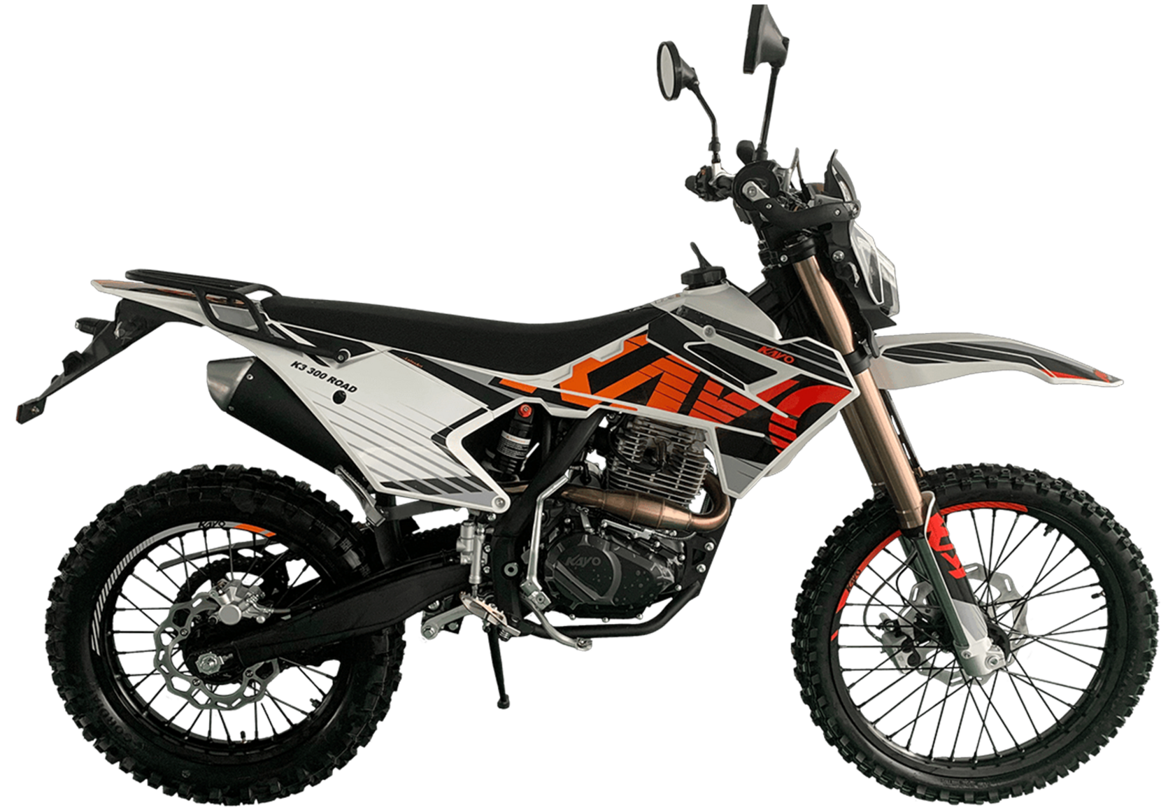 Мотоцикл KAYO K3 300 Road 21/18 2025 – модель нового прорывного эндуро, модернизированная для поездок по дорогам общего пользования. Модель Road имеет ПТС и всё необходимое снаряжение: приборная панель, указатели поворота, стоп-сигнал, звуковой сигнал, зеркала заднего вида. Для перевозки грузов установлена задняя багажная платформа, а для поездок с пассажиром имеется дополнительная пара подножек.Мотоцикл оснащён одноцилиндровым 4-тактным двигателем ZONGSHEN PR300/ZS175FMM-5 объёмом 271,3 см³ с балансирным валом и воздушным типом охлаждения. Максимальная мощность в 21,75 л.с. достигается при 8500 об/мин, а максимальный крутящий момент 22 Нм при 6500 об/мин. Соотношение диаметра и хода поршня 75,0х61,4. Степень сжатия 9,29:1. Карбюратор NIBBI PE30 обеспечивает топливную экономность и бесперебойную работу в самых сложных заездах. На мотоцикле установлена 5-ступенчатая коробка передач и цепной привод. Запуск двигателя осуществляется с помочью электростартера или кикстартера. Объём топливного бака 10 литров.Спицованные колёса с алюминиевыми ободами имеют диаметр 21 дюйм спереди и 18 сзади. Для подвески спереди используется телескопическая вилка перевёрнутого типа длиной 830 мм, а сзади установлен моноамортизатор длиной 450 мм. Оба компонента регулируются. На мотоцикле установлены гидравлические дисковые тормоза с 2-поршневой системой спереди и однопоршневой сзади.Мотоцикл готов к самым суровым вызовам бездорожья. Удобное расположение фильтр-бокса позволяет легко обслуживать его после заездов. Руль оснащён алюминиевой защитой рук с высокими пластиковыми накладками. На мотоцикле используются ручки-«неломайки» с регулировкой положения рычага и короткоходная ручка газа.Габариты 2100х810х1180 мм, вес 109 кг. Клиренс 340 мм, колёсная база 1390 мм, высота по седлу 900 мм.