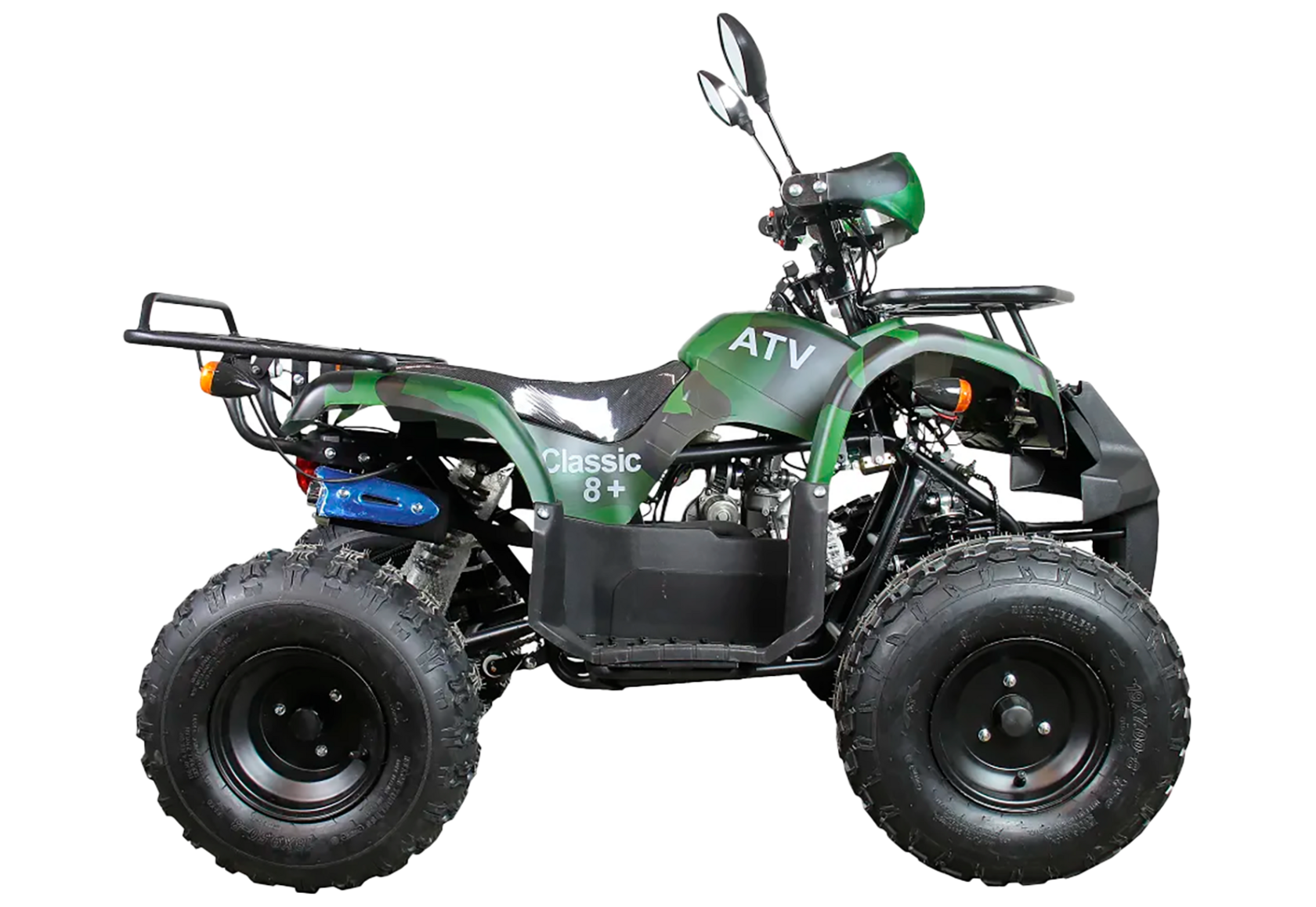 По габаритам это довольно компактный мотовездеход, при этом обладающий приличным двигателем и способный брать на борт человека весом до 120 кг. 125 кубов под капотом генерируют 9 л.с. Это как раз та цифра, которая позволяет полностью прочувствовать, что такое настоящий четырехколесник. При этом, квадроцикл ATV Classic 8 125 кубов универсален, и может использоваться даже детьми, так как его мощности не так много, чтобы малыш не справился с управлением. На малой скорости им очень легко маневрировать и учиться правильно тормозить, добавлять газа и входить в повороты.ДАННАЯ МОДЕЛЬ ПОСТАВЛЯЕТСЯ БЕЗ ПТС