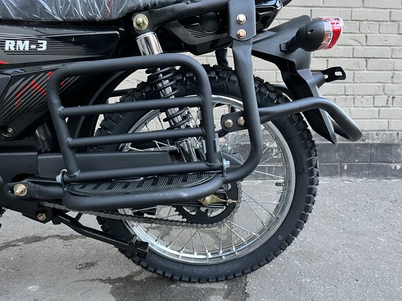 Комплектация Тормозная система – два барабанных тормоза. Усиленные тросы переднего тормоза и сцепления. Кроме того, на Regulmoto Alpha (RM-3) установлены зеркала заднего вида, подножки для пассажира, багажный кофр, пластиковые бардачки, кожух защиты цепи и дуги безопасности.
