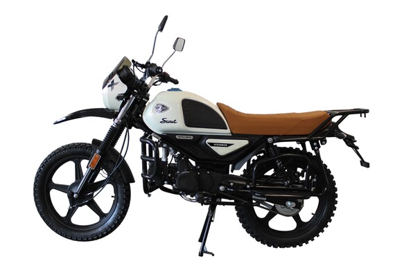 Комплектация Барабанные тормоза установлены на переднем и заднем колесе. Багажник, центральная и боковая подножки. Кофр,карманы передних дуг.