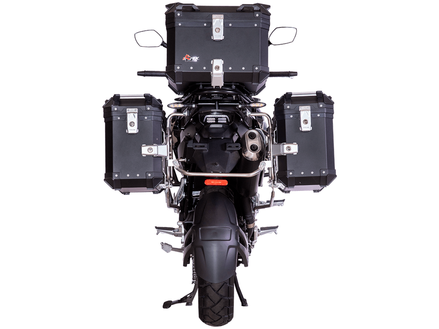 Мотоцикл CYCLONE RX600 ADV 2025 ПТС – туристический эндуро для покорения самых непростых и протяжённых маршрутов.Силовая установка представлена 2-цилиндровым 4-тактным двигателем DOHC объёмом 550 см³ с 4 клапанами на каждом цилиндре. Мощность в 59,9 л.с. достигается при 8500 об/мин, а максимальный крутящий момент 55 Н·м при 6500 об/мин. Соотношение диаметра цилиндра и хода поршня 72х67,6 мм. Степень сжатия 11:1. Жидкостная система охлаждения не допустит перегрева двигателя даже на самых непростых маршрутах. Механическая коробка передач имеет 6 ступеней.Максимальная скорость 170 км/ч.Объём топливного бака 18 литров.На мотоцикл установлены спицованные алюминиевые колёса диаметром 19 дюймов спереди и 17 дюймов сзади. В качестве передней подвески используется телескопическая вилка перевёрнутого типа с ходом 130 мм, а задней – маятник с моноамортизатором с ходом 55 мм. Оба компонента подвески регулируются. На переднее колесо установлены 2 тормозных диска диаметром 305 мм с 4-поршневыми суппортами, а сзади используется тормозной диск 258 мм с однопоршневым суппортом с плавающей скобой. Дополнительно на оба колеса установлена настраиваемая ABS-система.Габариты мотоцикла 2160х870х1399 мм, вес 219 кг. Клиренс 175 мм, колёсная база 1410 мм, высота по седлу 810 мм.Оснащён противобуксовочной системой и датчиками давления в шинах. Для освещения используется диодная светотехника. Многофункциональная приборная панель имеет TFT-дисплей. На руле установлена подсветка пультов. Для зарядки устройств имеется USB-порт. Также есть защитные дуги, защита двигателя, 3 кофра и центральная подставка.