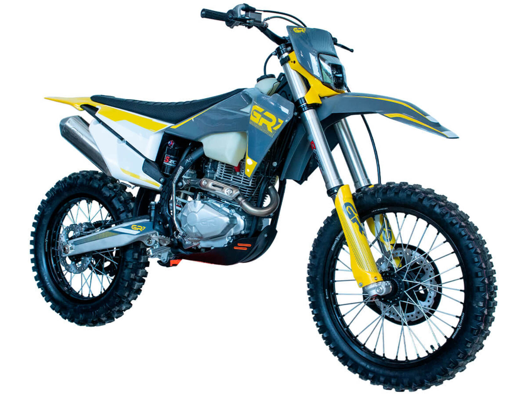 Мотоцикл GR7 F300A (4T CB300) Enduro Lite 2024 модельного года – идеальный снаряд для внедорожного экстрима, представляющий собой оптимальный баланс производительности и технической оснащённости. Модель обладает высокими характеристиками, которые позволяют ей справляться с непростыми условиями маршрутов как на кроссовых трассах, так и в хард-эндуро. Модификация GR7 F300A (4T CB300) Enduro Lite является самой доступной базовой версией полноразмерных мотоциклов GR.Одноцилиндровый 4-тактный двигатель воздушного охлаждения ZONGSHEN CB300/ZS175FMM с четырьмя клапанами имеет объём 287 см3 выдаёт 24 л.с., что позволяет развивать большую скорость и с лёгкостью преодолевать трассы со сложным рельефом. Карбюратор NIBBI PE30 обеспечивает бесперебойную работу техники в самых жёстких условиях эксплуатации, простоту и лёгкость в обслуживании, а также неприхотливость к качеству топлива.Мотоцикл оснащён 5-ступенчатой механической коробкой передач с классической схемой “1-N-2-3-4-5”.Мотоциклы GR 2024 построены на совершенно новой раме. Она всё так же выполнена из хром-молибденовой стали, но конструктивно стала другой. Новая архитектура и новый дизайн повторяют характеристики KTM 2024. Рама, по сравнению с предыдущим модельным годом, стала более жёсткой на скручивание, усилены рулевая колонка и треугольник крепления заднего амортизатора. На мотоцикл установлен стандартный руль переменного сечения Fatbar.Передняя подвеска — телескопическая вилка перевёрнутого типа с фрезерованной траверсой SZC Lite длиной 940 мм, задняя —моноамортизатор SZC Lite длиной 480 мм с фрезерованной прогрессией. Оба компонента подвески регулируются на сжатие. В паре они позволяют эффективно амортизировать удары при езде по неровностям и препятствиям на трассе. Мотоцикл оснащён классическими спицованными колёсами с ободами UNISON диаметром 18 и 21 дюйм. Диски и задний маятник выполнены из алюминия.Эффективное и безопасное замедление с любых скоростей обеспечивают гидравлические дисковые тормоза – спереди установлен двухпоршневой суппорт SZC и тормозной диск диаметром 260 мм, а сзади – однопоршневой суппорт SZC с диском диаметром 220 мм. Диск переднего тормоза и перья вилки защищены специальными кожухами.Мотоцикл достаточно компактен и имеет вес всего в 116 кг. Прозрачный топливный бак вмещает 8 литров горючего. Высококачественная износостойкая резина с развитым протектором отлично держит дорогу на различных типах покрытия и в самых разных поворотах. Данная модель укомплектована счётчиком моточасов и яркой фарой, которая позволяет кататься в тёмное время суток.GR7 F300A (4T CB300) Enduro Lite сочетает в себе отличные технические характеристики, комфорт и надёжность, что позволяет вам ощутить настоящую свободу на любой трассе.