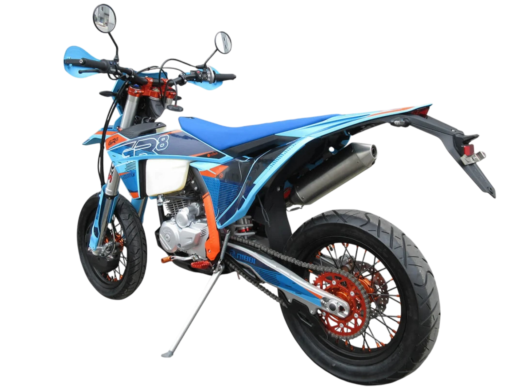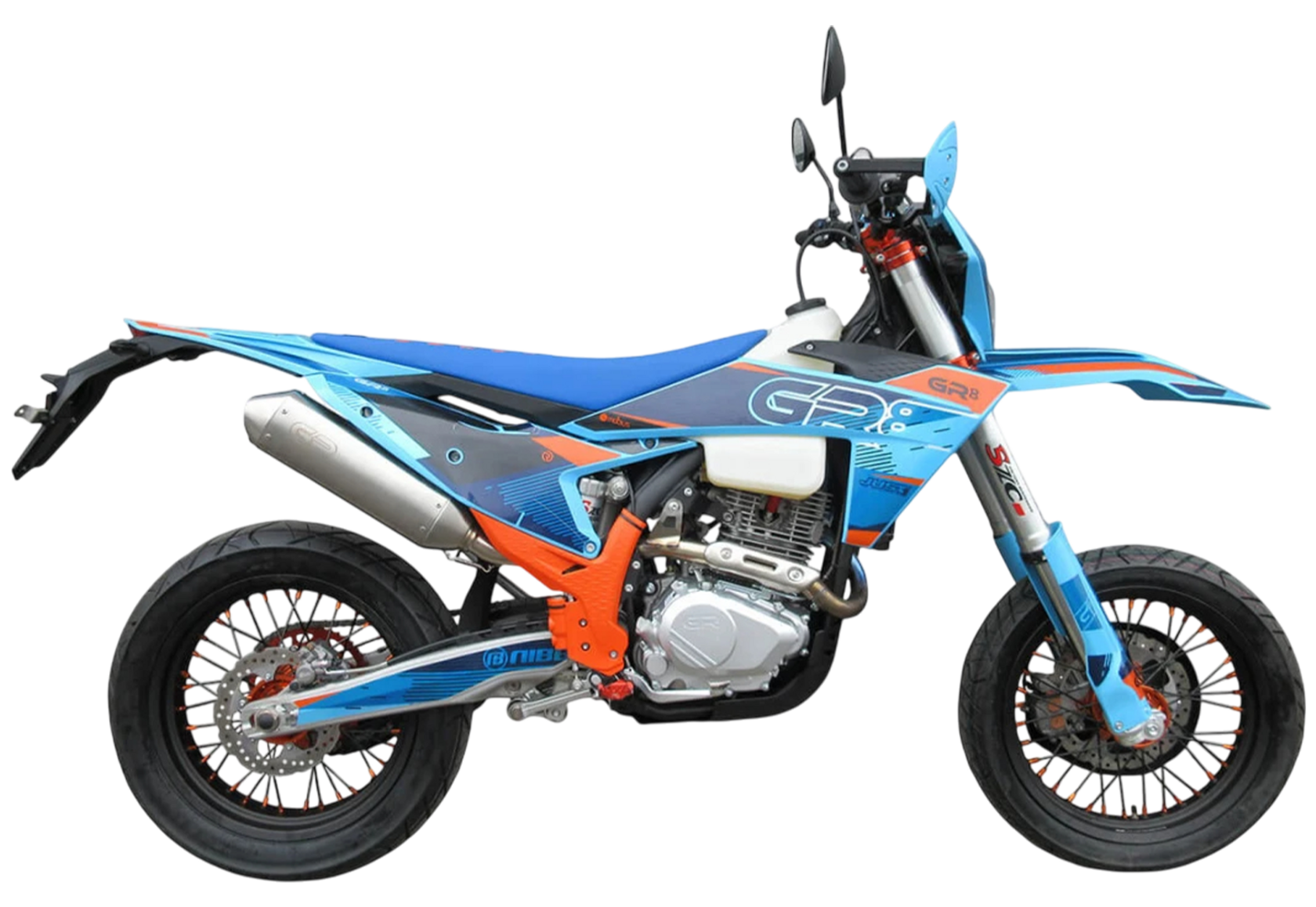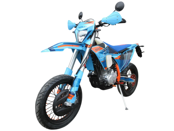 Мотоцикл-мотард GR8 F300A (4T CB300RL) Motard 2024 модельного года является городской версией модели GR8 F300A, адаптированной под езду по асфальту, имеющей шоссейную резину, полный набор светотехники и ПТС. Этот мотоцикл представляет собой оптимальный баланс производительности и технической оснащённости и создан для тех, кто не хочет расставаться с эндуро даже в городе. Идеальный снаряд как для гонок в классе супермото или стант-райдинга, так и для повседневной городской езды.Обновлённая модификация 2024 года вобрала весь опыт инженеров компании прошлых лет, а также самые последние наработки GR. Мотоцикл стал более производительным, комфортным и привлекательным.Одноцилиндровый 4-тактный двигатель воздушного охлаждения с 4 клапанами CB300RL ZS175FMN имеет объём 271 см³ и выдаёт 27 л.с., что позволяет развивать большую скорость и эффективно ускоряться после прохождения поворотов. Карбюратор NIBBI PWK32 обеспечивает бесперебойную работу техники в самых жёстких условиях эксплуатации, простоту и лёгкость в обслуживании, а также неприхотливость к качеству топлива.Трансмиссия представлена 6-ступенчатой механической коробкой передач с классической схемой 1-N-2-3-4-5-6.Модель 2024 года собрана на новой раме, а также обладает ярким пластиком с обновлённым дизайном.Передняя подвеска – телескопическая вилка перевёрнутого типа SZC Optima длиной 940 мм, регулирующаяся на сжатие и отбой. Перья вилки снабжены защитными кожухами. Сзади установлен моноамортизатор с прогрессией SZC Optima длиной 480 мм, также регулируемый на сжатие и отбой. Рычаг прогрессии даёт преимущество, эффективно “отрабатывая” небольшие неровности.Мотоцикл оснащён классическими спицованными колёсами диаметром 17 дюймов, обутыми в шоссейную резину. Эффективное и безопасное замедление с любых скоростей обеспечивают гидравлические дисковые тормоза – спереди установлен 2-поршневой суппорт SZC и тормозной диск диаметром 260 мм, а сзади – однопоршневой суппорт SZC с диском диаметром 220 мм. Диск переднего тормоза снабжён специальным защитным кожухом.Топливный бак вмещает 8 литров горючего.Мотоцикл укомплектован защитой кистей с пластиковыми “лопухами”, а также яркой фарой, которая позволяет кататься в тёмное время суток.Благодаря наличию ПТС и необходимого светового оборудования мотоцикл можно поставить на учёт, чтобы ездить по дорогам общего пользования.GR8 F300A (4T CB300RL) Motard сочетает отличные технические характеристики, комфорт и надёжность, что позволяет ощутить свободу на любой трассе.