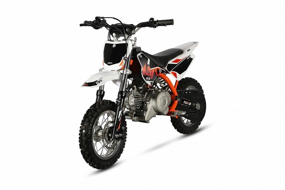 Питбайк KAYO Mini К125EM 14/12 – идеальный снаряд для юных экстремалов, который можно использовать на лёгких кроссовых трассах и дорогах с различным покрытием. Подходит для детей от 10 лет, желающих освоить технику езды на внедорожном мотоцикле. Удобный, простой и надёжный мотоцикл, который полностью оправдывает свою цену.Одноцилиндровый 4-тактный двигатель воздушного охлаждения производства KAYO объёмом 125 см3, выдаёт 9 л.с. Карбюратор NIBBI PE19 обеспечивает бесперебойную работу техники в самых жёстких условиях эксплуатации, простоту и лёгкость в обслуживании, а также неприхотливость к качеству топлива. Питбайк оснащён механической 4-ступенчатой коробкой передач с формулой “N-1-2-3-4”.Аппарат имеет вес всего 70 кг. Усиленная рама из хром-молибденового сплава и подвеска позволяют эффективно амортизировать удары при езде по неровностям и препятствиям на трассе. Передняя подвеска —телескопическая вилка длиной 625 мм, задняя —моноамортизатор 280 мм. Рама и пластик разработаны фирмой KAYO. Мотоцикл оснащён классическими стальными спицованными колёсами диаметром 14 дюймов спереди и 12 дюймов сзади. Эффективное и безопасное замедление с любых скоростей обеспечивают гидравлические дисковые тормоза марки HSK.Высококачественная износостойкая резина с развитым протектором отлично держит дорогу на различных типах покрытия. Аппарат оснащён системой запуска двигателя при помощи кнопки электростартера или при помощи рычага кик-стартера.Если вы ищете послушный, компактный, шустрый, красивый питбайк для своего малыша, считайте, что вы его нашли. Это один из лучших мотоциклов для обучения и первых шагов в эндуро и мотокроссе. Он отлично подойдёт как для гонок на трассе, так и для покатушек по пересечённой местности.
