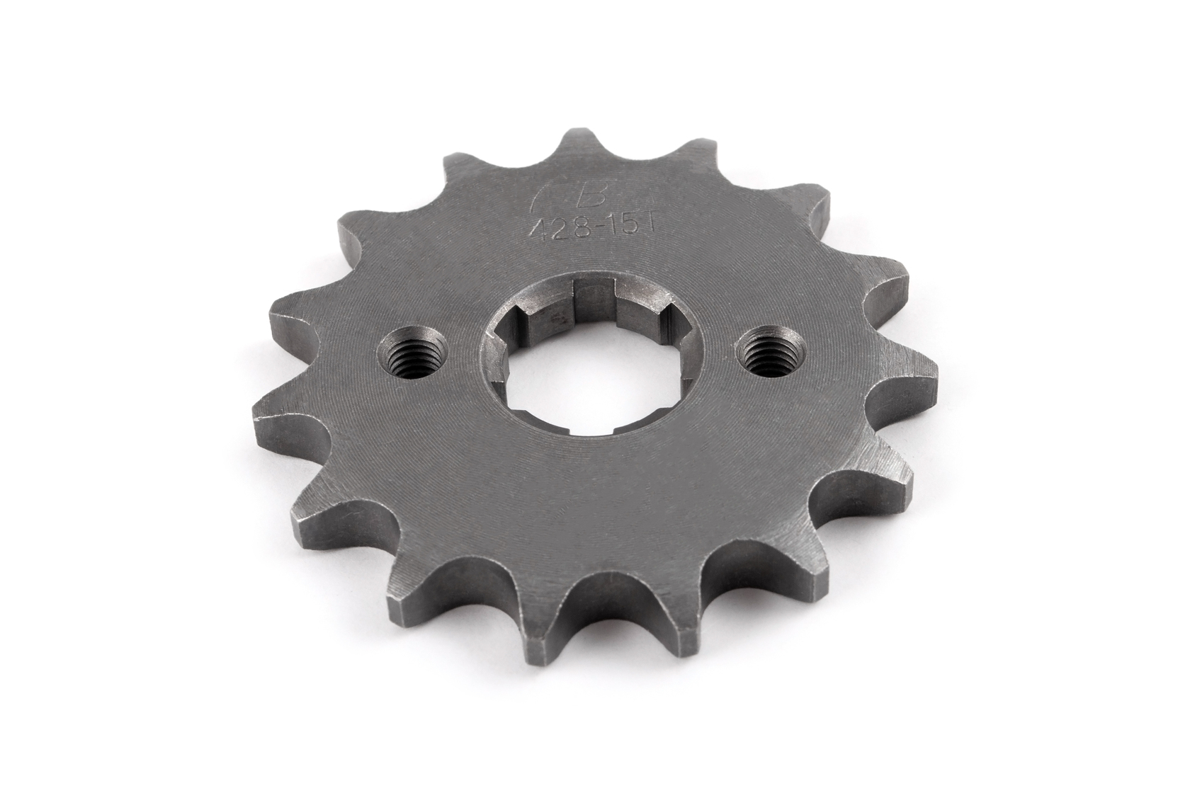 • Ведущая звезда с шагом цепи 428, 15 зубьями и посадочным отверстием 20 мм для эндуро и питбайков. Изготовлена из прочной стали, обеспечивает надежное зацепление с цепью и эффективную передачу мощности на заднее колесо. Прямая установка на шлицевой вал двигателя.