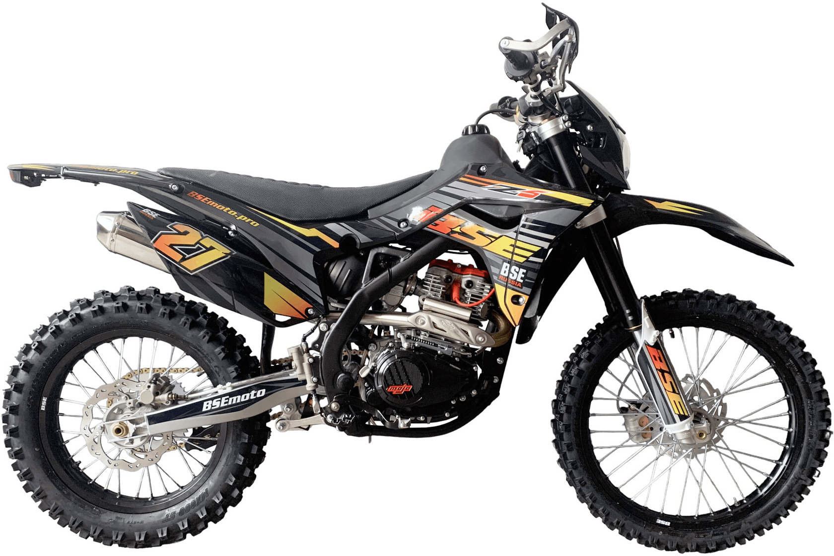 BSE Z5 - полноразмерный, функциональный и мощный эндуро мотоцкил. Идеально сбалансированный, устойчивый, мощный эндуро мотоцикл на прочнейшей усиленной стальной раме. Сердце Z5 – мощный, эластичный и надежный 250 кубовый Zongshen. Система подачи топлива – проверенный карбюратор Nibbi. Крепкий, надёжный и неприхотливый BSE Z5 обладает всеми качествами настоящего эндуро и любительского кросса. Подойдёт, как и для среднего уровня катания, так и порадует опытного спортсмена, благодаря регулируемой энергоемкой подвески c большими ходами, рычагам задней прогрессии и вилке “перевертышу”. Мощная гидравлическая тормозная система HSК Racing остановит байк в любых условиях. Легкосплавные усиленные алюминиевые диски, внедорожная резина, усиленная цепь – ваше возможности на бездорожье безграничны!