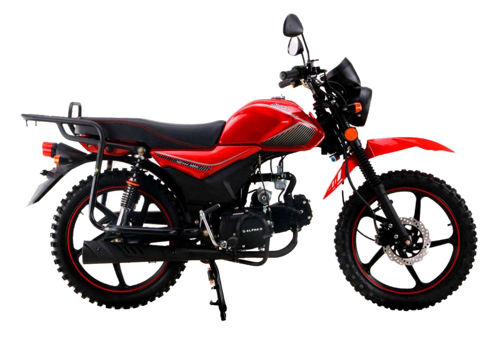 Мопед ROCKOT ALPHA OFFROAD M-12 LUX - люксовое исполнение и самые смелые желания ценителей мопедов “Альфа” воплощены в данной модели, вобравшей в себя все самое лучшее, а главное, практичное. ROCKOT ALPHA OFFROAD M-12 LUX доступен для покупки в шести цветовых вариантах: белый глянец, черный глянец, черный матовый, красный глянец, синий глянец, серый металлик.Внедорожные возможностиМопед ROCKOT ALPHA OFFROAD M-11 LUX прямо из коробки оснащен внедорожными (грязевыми) покрышками, которые обеспечат наилучшую проходимость и маневренность при движении по бездорожью.Для обеспечения качественной защиты от грязи установлены высокие внедорожные крылья. Высокое расположение не позволяет забиваться камням и грязи между колесом и крылом.Мопед ROCKOT ALPHA OFFROAD M-12 LUX оснащен надежным двигателем 139FMB. Охлаждение воздушного типа делает его еще более надежным, неприхотливым и простым в обслуживании. Объем данного мотора - 49 см³. В комплекте поставляется тюнинг-комплект, позволяющий увеличить объем двигателя до 125 см³, без замены коленчатого вала. четырехступенчатая коробка переключения передач мотоциклетного типа (1-N-2-3-4) делает мопед еще более простым и понятным в управлении, особенно для тех, кто уже умеет ездить на мотоцикле.Легкий запуск двигателя обеспечивает электростартер, но и кик-стартер, конечно же, присутствует и позволит запустить двигатель даже при разряженной аккумуляторной батарее. Аккумулятор входит в заводскую комплектацию. Мопед способен развивать скорость до 80 км/ч.Мопед сконструирован на прочной раме из стали. Геометрия рамы - хребтового типа. Данная конструкция превосходно себя зарекомендовала на малокубатурных мотоциклах марки Honda, и наилучшим образом подходит для мопедов ROCKOT ALPHA. Рама очень прочная и легкая, это вы заметите, обратив внимание на маневренность и легкость в управлении при первом же выезде.Внедорожный мопед ROCKOT ALPHA оснащен усиленной подвеской, с большим рабочим ходом. Спереди установлена вилка, состоящая из двух пружинно-масляных амортизаторов классического типа. Сзади - два пружинно-масляных амортизатора и усиленные пружины. Также в конструкции задних амортизаторов имеются демпферы сжатия и пружинные буферы.Мопед ROCKOT ALPHA OFFROAD M-12 LUX богат на современные решения, и тормозную систему не обошли стороной. Данный мопед оснащен дисковым гидравлическим тормозом спереди. Сзади установлен механический барабанный тормоз.Гидравлический передний тормоз является наиболее подходящим для езды по бездорожью, поэтому он стал неотъемлемой частью модели OFFROAD М-12 LUX.