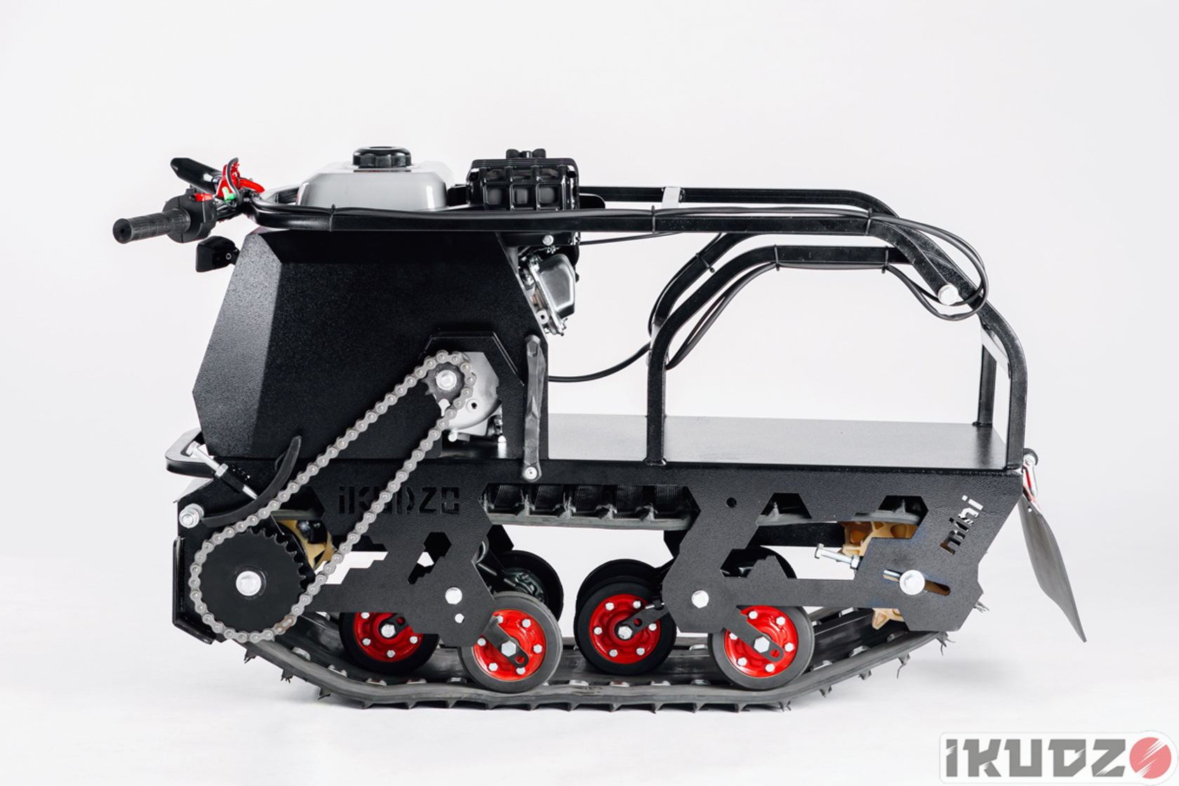 • 12. Мотобуксировщики IKUDZO имеют идеальную балансировку и нагрузку на гусеницу. Двигатель размещён так, что даже без дополнительного груза на мотособаке давление на снег будет равномерно, что значительно повышает проходимость!