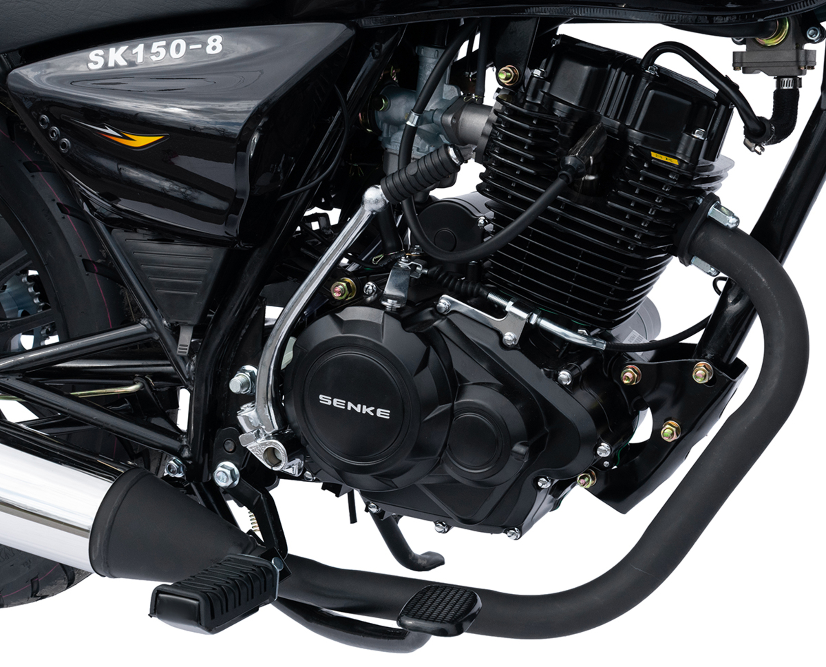 Мотоцикл Regulmoto SK 150-6 – классический «дорожник» с надежным и экономичным малокубатурным двигателем. Данная модель изготавливается на собственных мощностях крупного китайского производителя Senke, чья продукция пользуется заслуженной популярностью среди поклонников мототехники не только в Поднебесной, но и в странах Европы и Америки.Несмотря на классический внешний вид Regulmoto SK 150-8 отличается достаточно интересным и продуманным дизайном. В раме мотоцикла установлен одноцилиндровый 4-тактник с воздушным охлаждением с рабочим объемом в 149 см3. Двигатель можно запускать как кнопкой электростартера, так и при помощи традиционного кик-стартера. В целом байк выглядит лаконичным и современным – еще одной приметой актуальных трендов стали литые диски переднего 18-дюймового и заднего 16-дюймового колес. Также на переднем колесе установлен дисковый тормоз, хотя в ступице заднего колеса реализован проверенный многими десятилетиями вариант с тормозом барабанного типа. Характерная для «дорожников» подвеска представлена телескопической вилкой впереди и двумя амортизаторами сзади.Широкое комфортное сиденье и вместительный бак Regulmoto SK 150-8 недвусмысленно указывают на назначение мотоцикла, окончательную ясность вносят багажник, складывающиеся пассажирские подножки и наличие мощной центральной подножки. Безопасность эксплуатации на дорогах общего пользования обеспечивают обязательный комплект зеркал заднего вида и светового оборудования, включающего фару головного света, светодиодные поворотники и стоп-сигнал. Этот мотоцикл станет отличным выбором в качестве транспортного средства на каждый день и позволит своему обладателю с комфортом решать широкий круг повседневных задач.