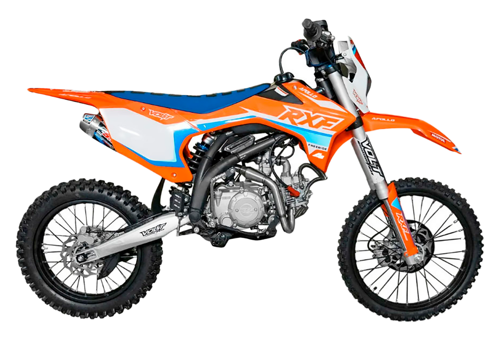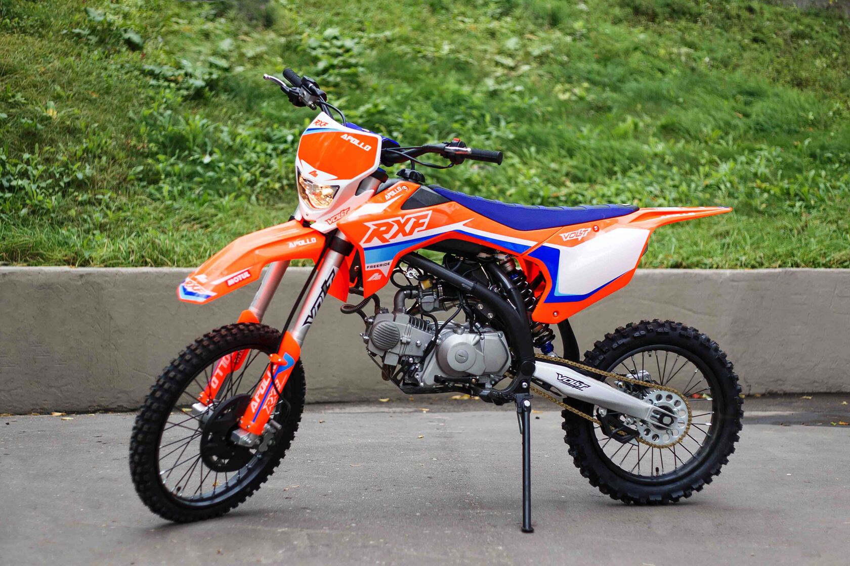 Питбайки компании Apollo родом из Франции. Головной офис компании расположен в Париже. Идеология, заложенная в бренд, носит спортивный характер. Улучшение “породы” происходит в гонках.Модели Apollo RXF (17/14) безошибочно узнаваемы благодаря хребтовой раме с V образным профилем боковой проекции начинающейся от точки крепления маятника под углом 45 градусов. Геометрия рамы была переработана и полностью учитывает размерность применяемых колес, а расстояние от подножек до седла одно из самых больших, что в свою очередь благотворно влияет на езду в стойке.Подвески питов оснащаются вилками и амортизаторами volt, топовые модели имеют регулировки по отбою. На всех моделях установлены двигатели YX, с объемами: 125, 140 и 150 см3 (последний с разными типами ГБЦ) Так же в модельном ряде появился самый кубатурный мотор ZongSheng 190 см3, оснащенный 5 ступенчатой КПП и электростартером.Хочется отметить, что компания Apollo в линейки RXF, закончило полноценную интеграцию и оптимизацию моделей под “большие колеса”. Это можно заметить при взгляде на питбайки в боковой проекции. Расстояние между баком и рулевой колонкой потеряло “зазор”, причина которого крылась в наращивание переднего треугольника под 17 колесо. Сейчас это пространство полноценно поглотил бак, который в свою очередь увеличил объем с 4,7 литров до внушительных 6,5 л. Полностью новый пластик оптимизирован под пропорции “выросшего питбайка”, сиденье стало тоньше и изящнее, боковые щитки увеличены в размерах, глубокий разрез по боковой линии подчеркивает раму, удлиненное заднее крыло и полностью новое передние, не оставляют шансов грязи. Тормозные диски получили пластиковую защиту, амортизатор брызговик, а карбюратор фильтрбокс. Продуманность компоновки питбайка выгодно отличает данную марку от других брендов.Проделанная работа позволила вернуть визуальную целостность модели, которой обладала вся серия Apollo на колесах 14/12.