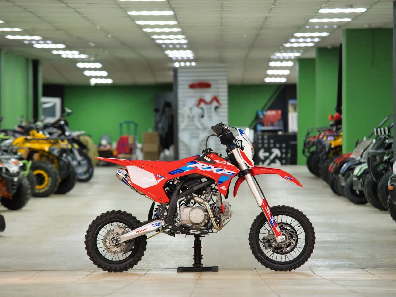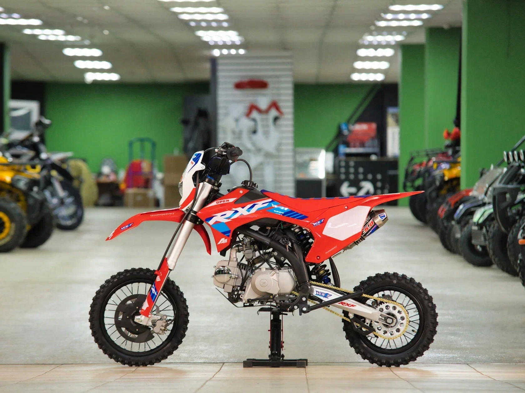 Apollo RXF Open - надёжный питбайк, разработанный инженерами Apollo во Франции. Модели RXF Open оснащены вилочными подвесками V-one Volt Suspension длиной 810 мм. Амортизатор V-One последнего поколения Volt Suspensions, был специально разработан, чтобы позволить раме извлечь выгоду из лучшего сцепления при использовании на бездорожье! Новый фильтрбокс устанавливается на всю линейку RXF. Особенностью этого фильтрбокса является съемный выдвижной ящик, требуется меньше 30 секунд, чтобы сменить воздушный фильтр! RXF Open оснащен тормозными дисками размером 220 мм спереди и 190 мм сзади для достижения максимально эффективного торможения. Модель RXF теперь стандартно оснащены цепями 428 вместо 420 у моделей конкурентов. Модели RXF Open оснащены надежным 4 тактным одноцилиндровым двигателем YX 125 кубиков и комплектуются колесами 14/12.У нас Вы можете купить этот питбайк с бесплатной доставкой по РФ и гарантией до года. Также его можно приобрести в рассрочку или в кредит.