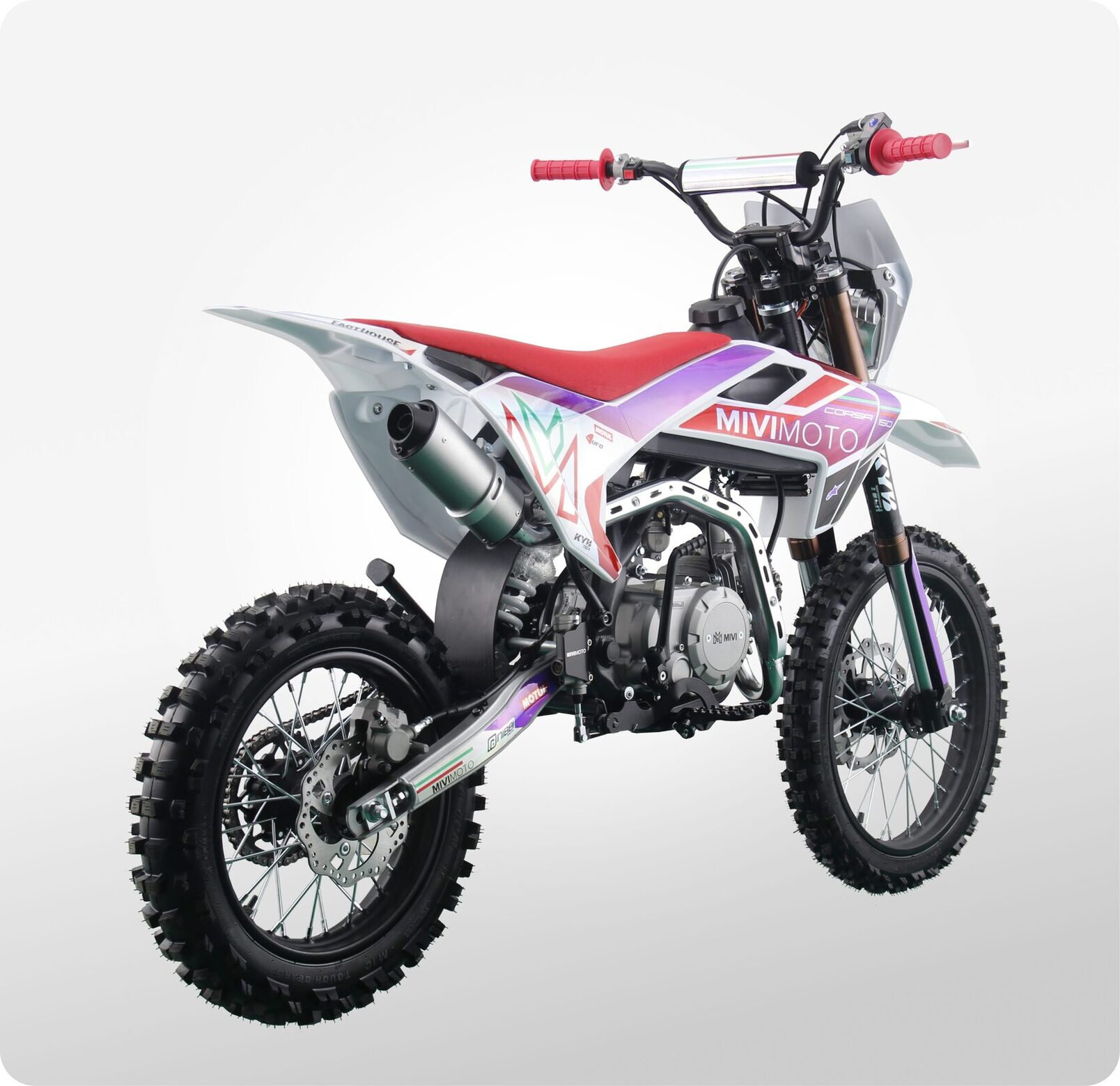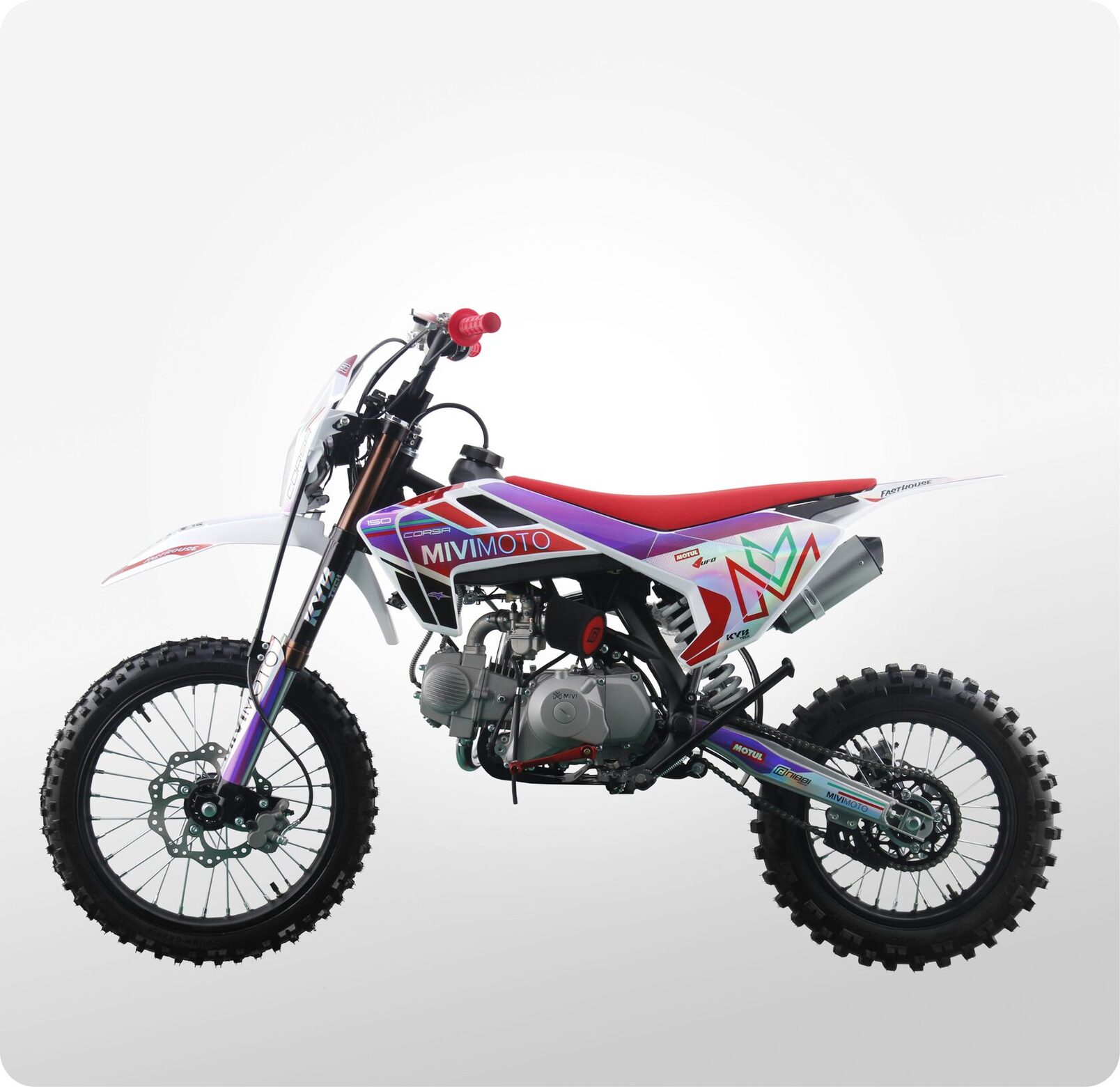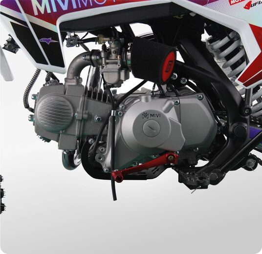 MIVIMOTO CORSA 150 — настоящий байк для тех, кто не боится скорости и любит преодолевать препятствия. Мощный 150-кубовый двигатель выдает 12 лошадиных сил, обеспечивая динамичный разгон и плавный ход как по дорогам, так и по бездорожью.- Четырехтактный двигатель сочетает в себе мощность и надежность, а также дополнительно оснащен масляным радиатором для более эффективного охлаждения при больших нагрузках. Карбюратор Nibbi Racing PE22 обеспечивает стабильную подачу топлива, а электростартер делает запуск легким и удобным.- Прочная стальная рама. Конструкция выдерживает серьезные нагрузки, сохраняя устойчивость как при активной езде, так и в экстремальных условиях.- Спереди питбайк оснащен перевернутой телескопической вилкой KYB tech, сзади — моноамортизатором с регулируемой жесткостью. Конфигурация обеспечивает плавный ход, хорошую отработку неровностей и комфорт при прыжках и резких маневрах.- Тормоза. Фирменные гидравлические дисковые тормоза HSK на обоих колесах обеспечивают точное и быстрое торможение в экстремальных условиях.- Питбайк оснащен светодиодной фарой, что позволит использовать его в темное время суток, и сиденьем из противоскользящего материала.